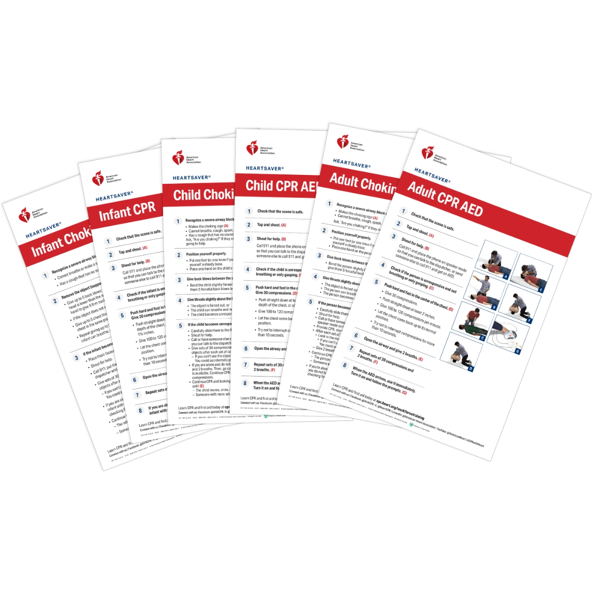 The Heartsaver Poster pack is a 12-poster set which includes posters illustrating the lifesaving skills of CPR AED and choking relief for adults, children, and infants.